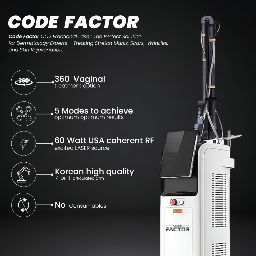 Thus, the Code Factor combines precision energy delivery, advanced fractionation technology, and multi-mode functionality to provide superior outcomes in skin resurfacing, tightening, scar revision, pigmentation treatment, and intimate health care.