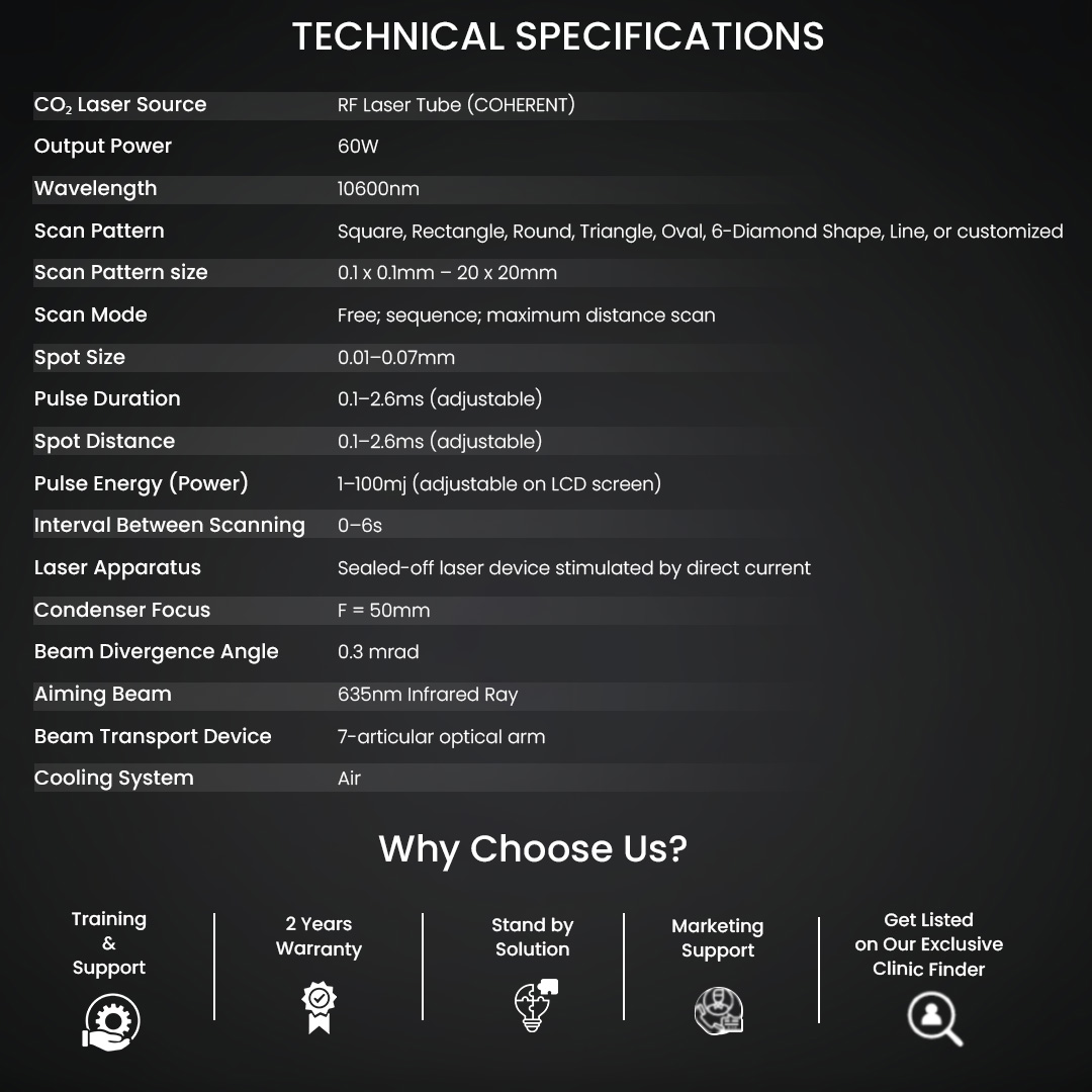 The fractional delivery system ensures faster healing and reduced downtime compared to traditional CO₂ lasers, as untreated skin around the microthermal zones accelerates recovery. This makes the treatment safe, effective, and suitable for various skin types.