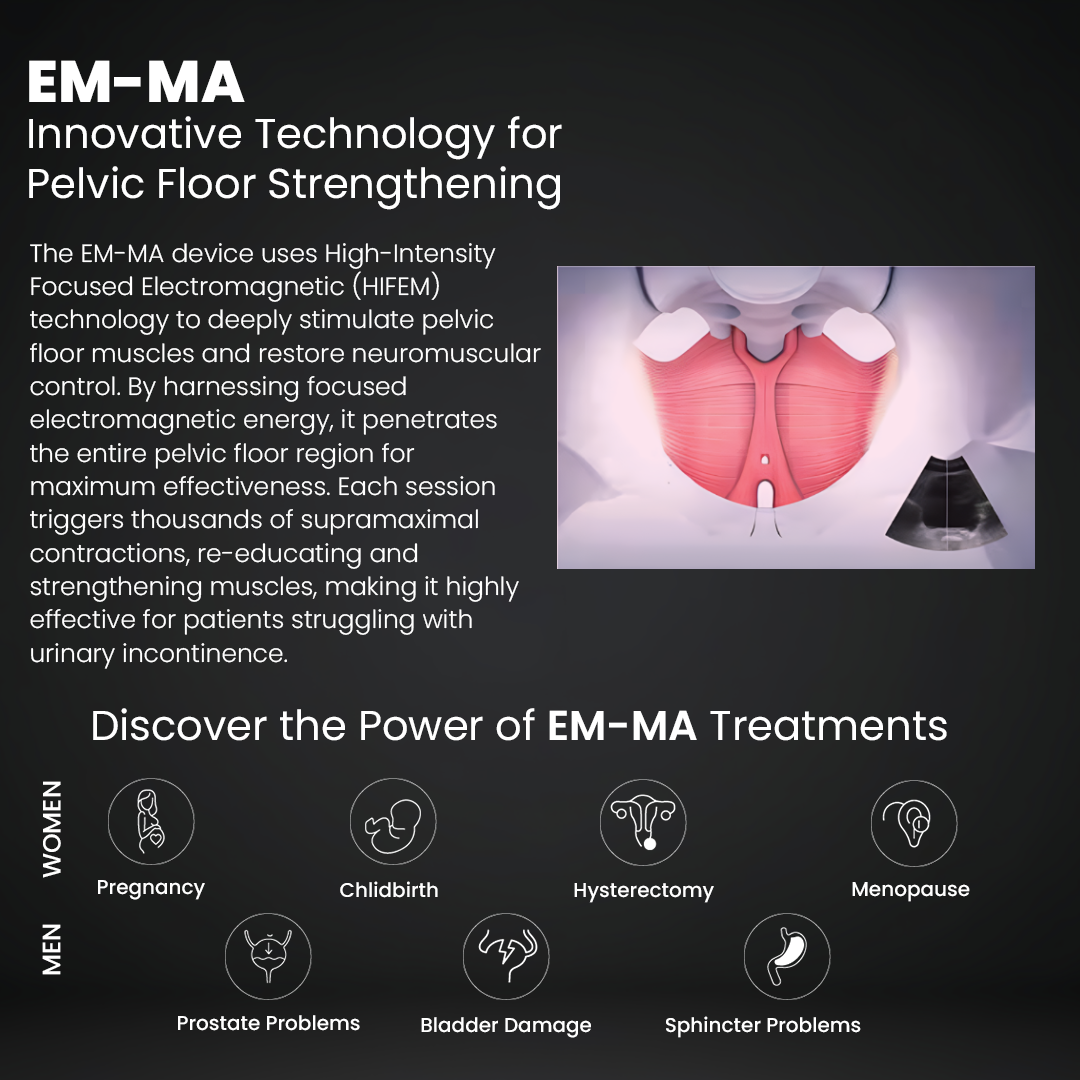 The EM-MA Machine is an FDA-approved, non-invasive device that utilizes advanced High-Intensity Focused Electromagnetic (HIFEM) technology to target and strengthen pelvic floor muscles. enhance sexual wellness & urinary incontinence, and reduce urinary incontinence for both men and women. Unlike traditional exercises, each 30-minute session with the EM-MA Machine delivers up to 12,000 supramaximal contractions. far beyond what voluntary exercise can achieve. These powerful contractions re-educate and activate deep pelvic muscles, restoring neuromuscular control and significantly improving overall pelvic health. Clinically validated through over two years of research and more than 100 patient cases, the device has shown remarkable outcomes. with 95% of patients reporting noticeable improvements in daily life, bladder control, and intimate wellness.