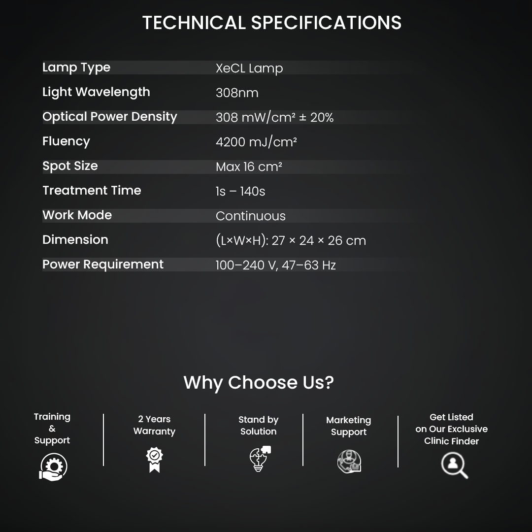 In summary, the EXCIMER ET-308 harnesses 308nm UVB excimer laser technology to provide safe, effective, and targeted skin therapy, making it an advanced solution for dermatologists and clinics seeking clinically proven vitiligo management, psoriasis therapy, and eczema care.