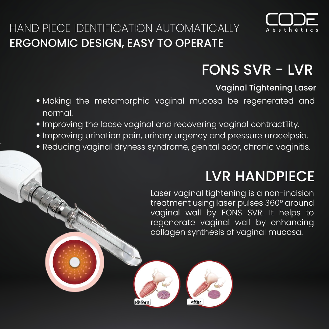 FONS-SVR by Code Aesthetics is an advanced CO₂ fractional laser with a 10,600 nm wavelength, designed for vaginal tightening, SUI, and skin rejuvenation. It features multiple treatment modes (LVR, FL, SL) and a 360° rotating handpiece for precise energy delivery. The device ensures safe, comfortable treatments with minimal downtime. Perfect for professional aesthetic and medical clinics seeking high-precision laser solutions.