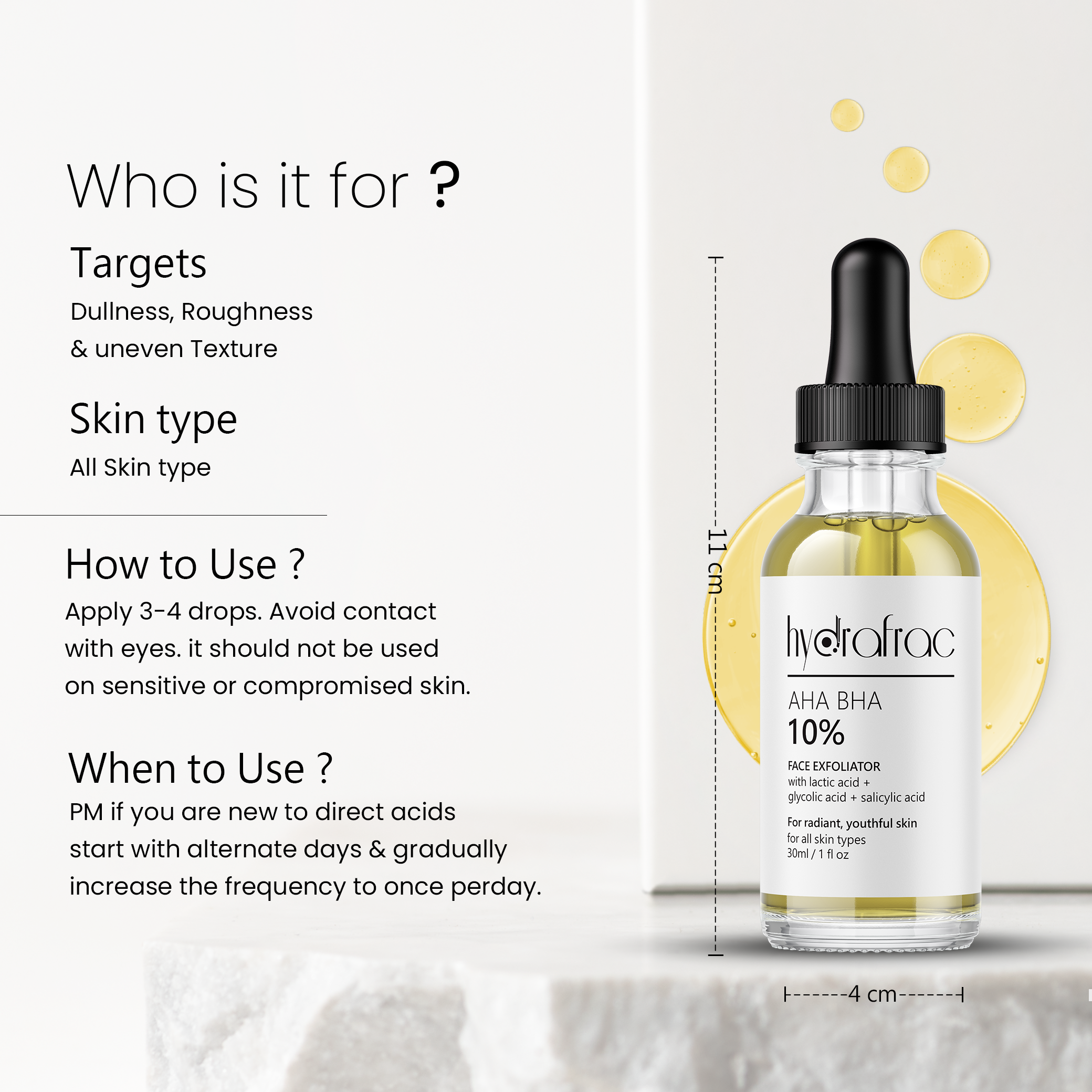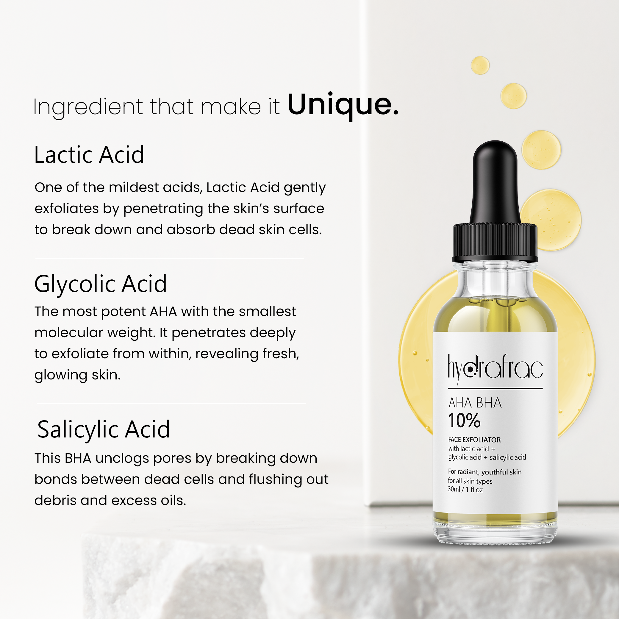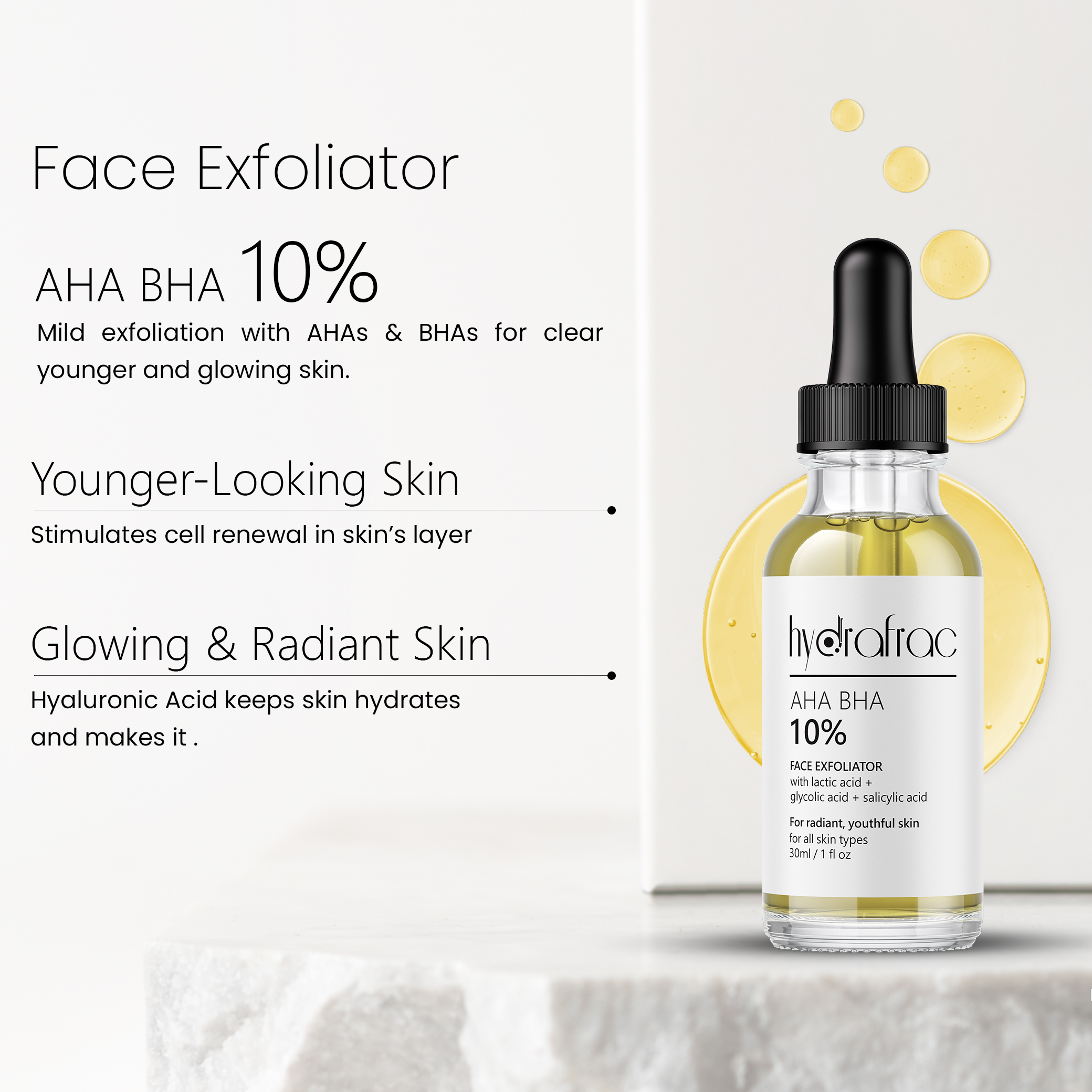 HydraFrac AHA BHA 10% Face Exfoliator | Gentle Chemical Peel Serum for Clear, Glowing & Smooth Skin