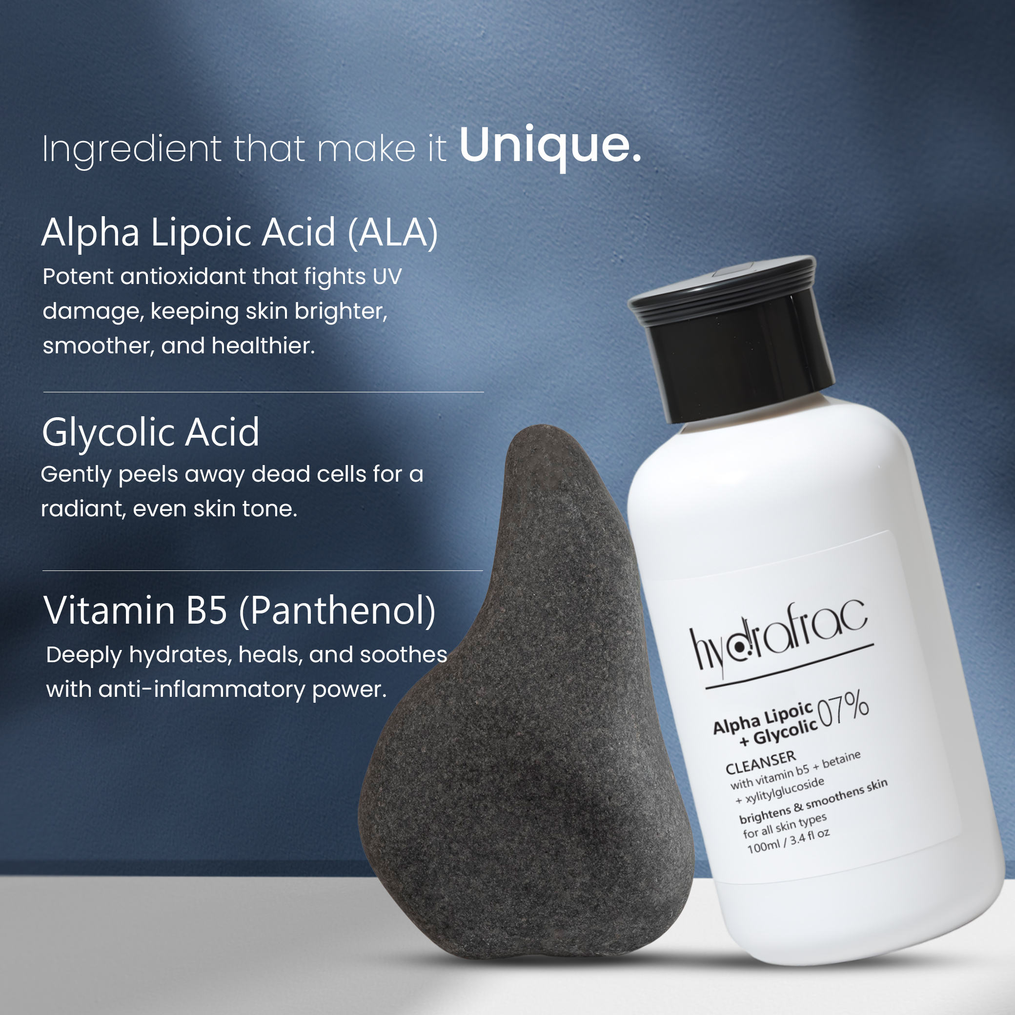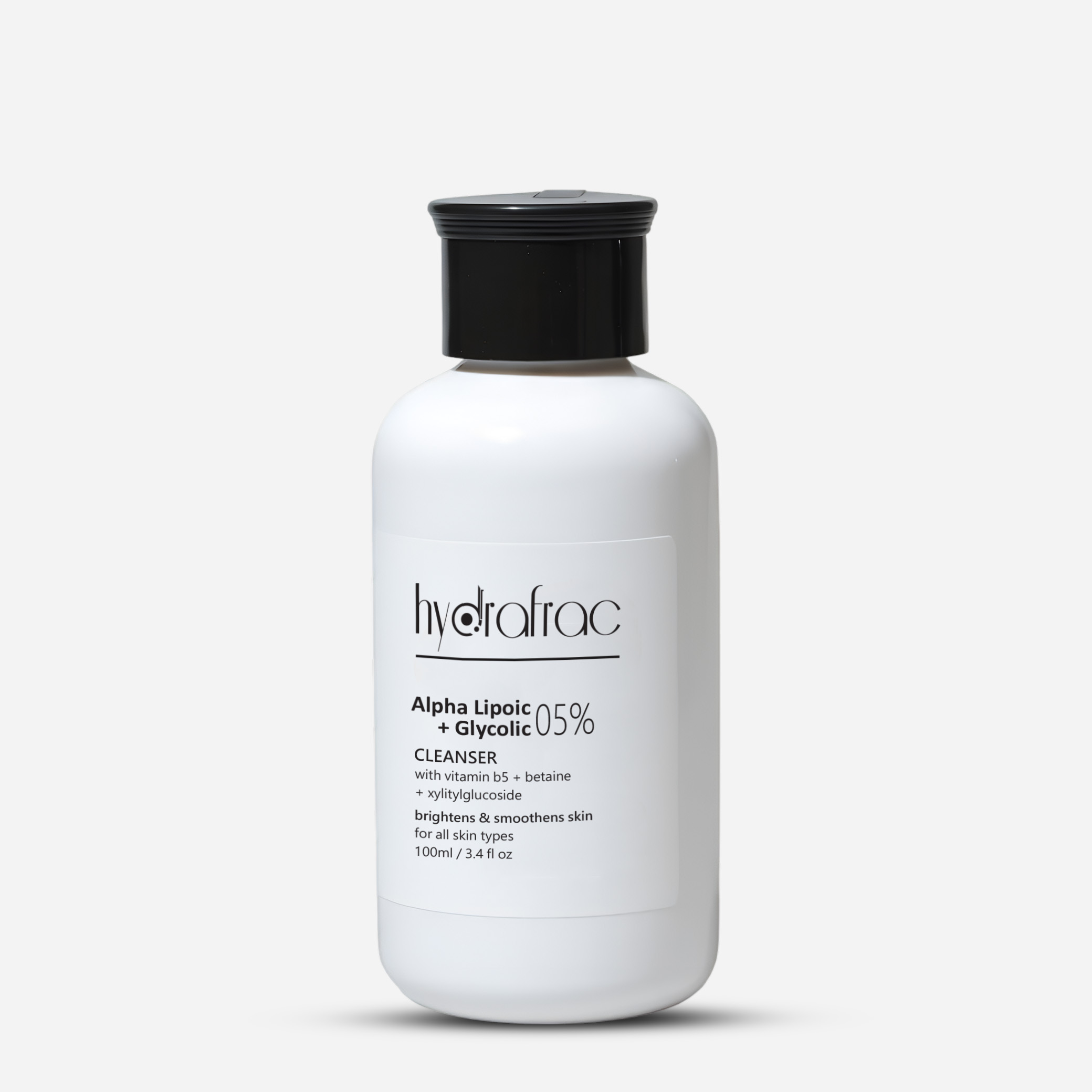Say hello to clearer, brighter, and smoother skin with the HydraFrac Alpha Lipoic + Glycolic 7% Cleanser. This daily-use cleanser combines the antioxidant power of Alpha Lipoic Acid (ALA) with the exfoliating benefits of 7% Glycolic Acid to gently polish away dullness, refine uneven texture, and restore a healthy glow. Enriched with Vitamin B5 and Allantoin, it cleanses without stripping, leaving your skin refreshed, hydrated, and radiant.