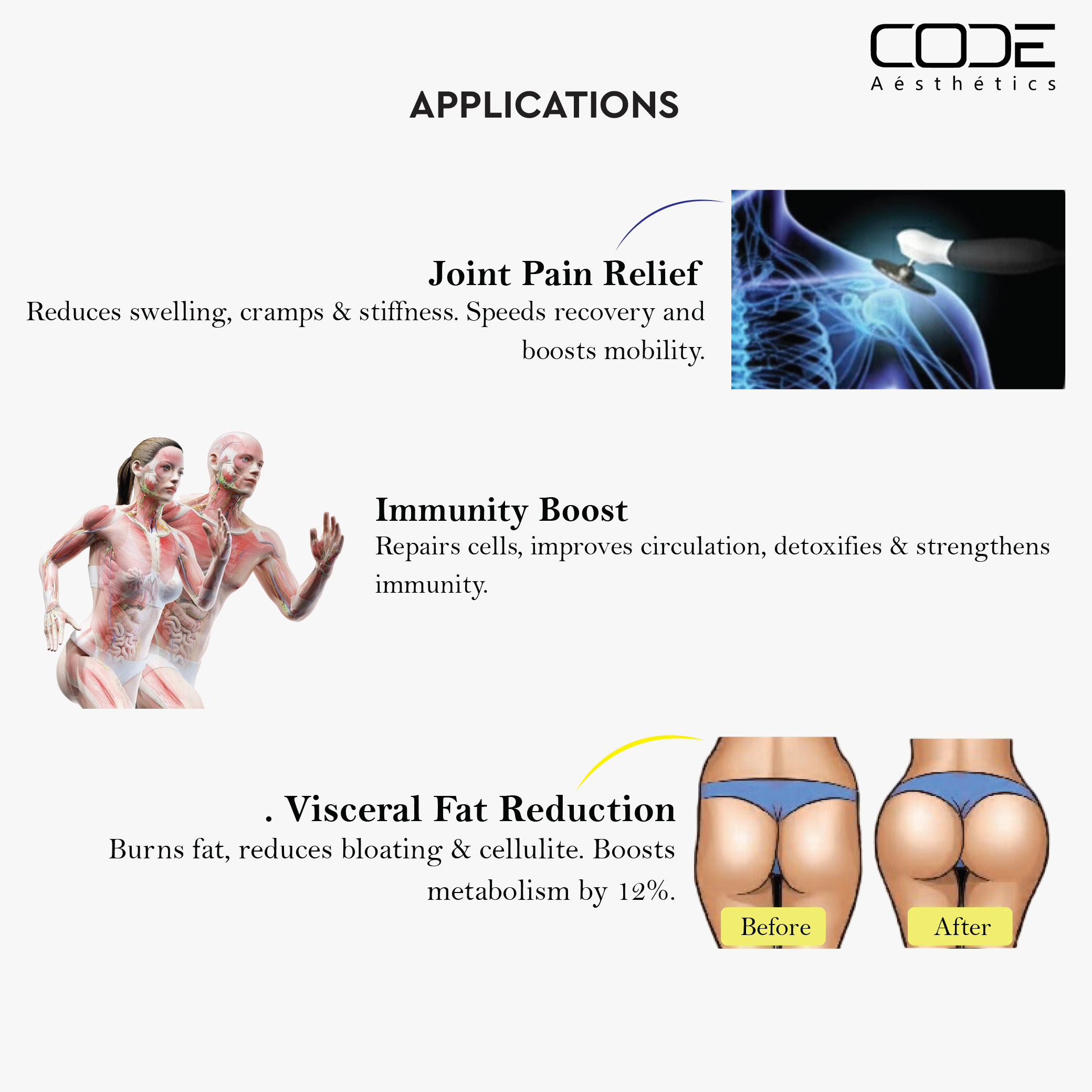 | Treatment Areas | Face, Neck, Abdomen, Arms, Thighs, Back, Joints |