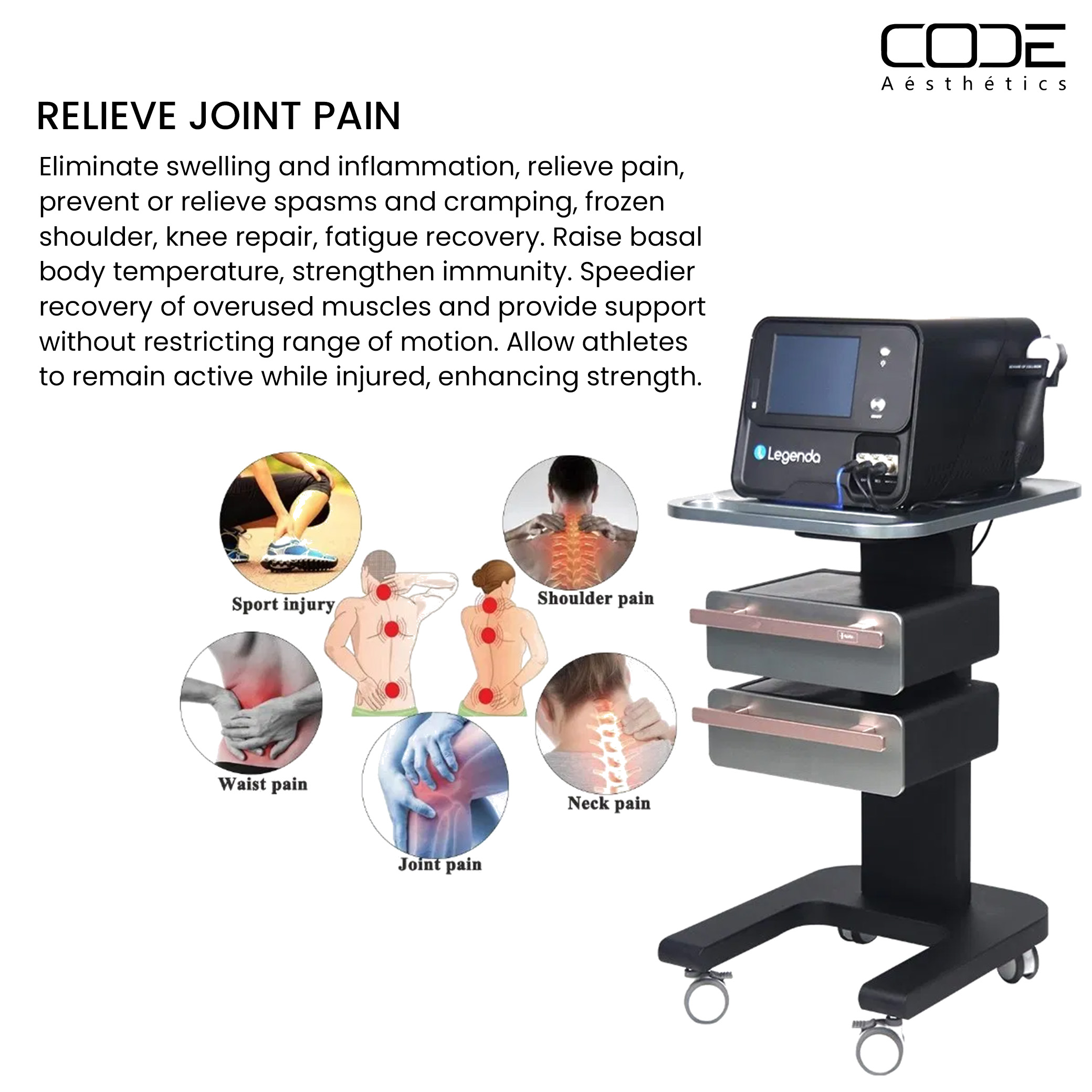 Legenda Deep Beauty Machine helps eliminate swelling and inflammation, relieve pain, prevent spasms and cramps, and support conditions like frozen shoulder, knee repair, and muscle fatigue recovery. It raises basal body temperature, strengthens immunity, and accelerates recovery of overused muscles while allowing full range of motion. Athletes can remain active during recovery, improving strength and muscle tone in weak or poorly-toned areas.