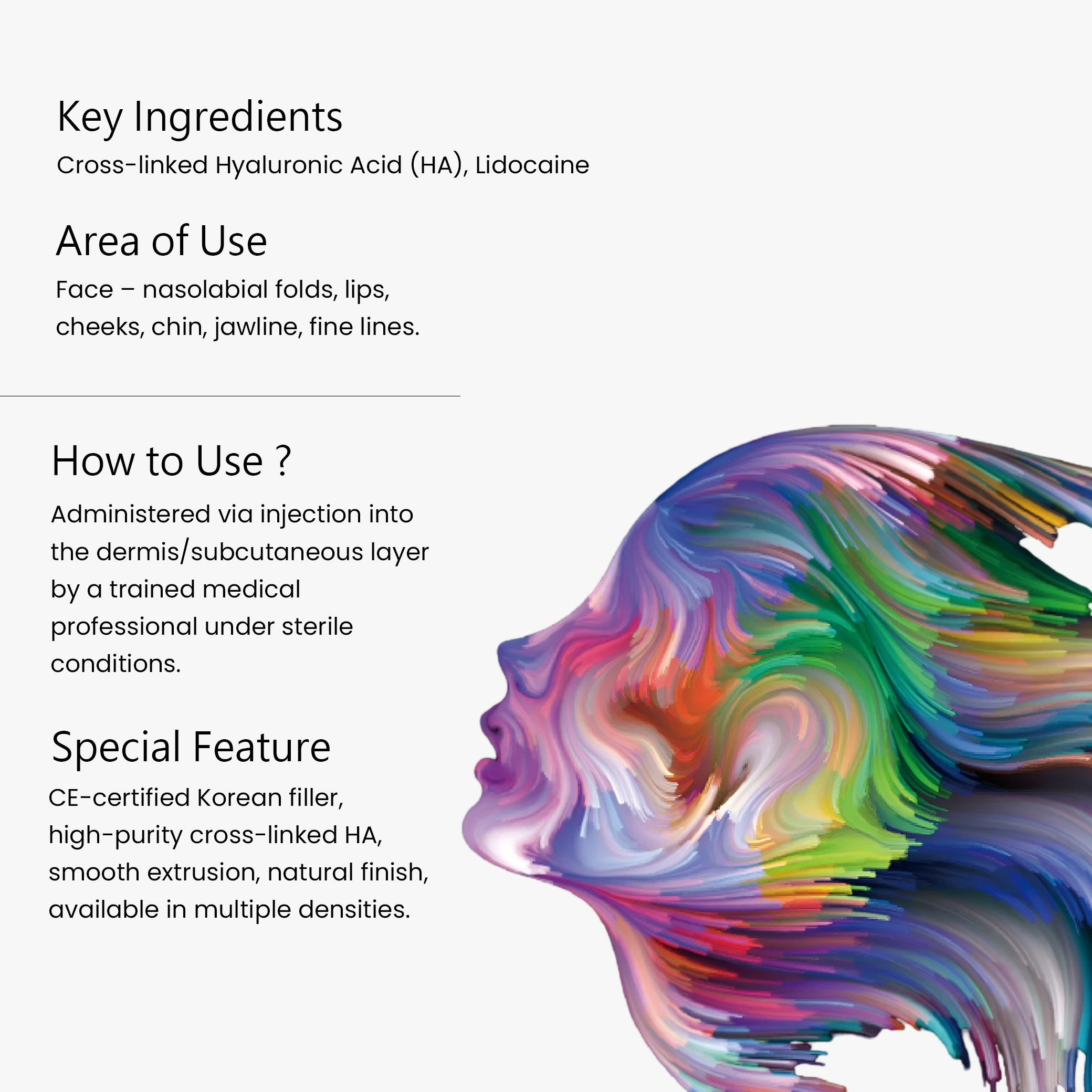 CE-certified Korean filler, high-purity cross-linked HA, smooth extrusion, natural finish, available in multiple densities.