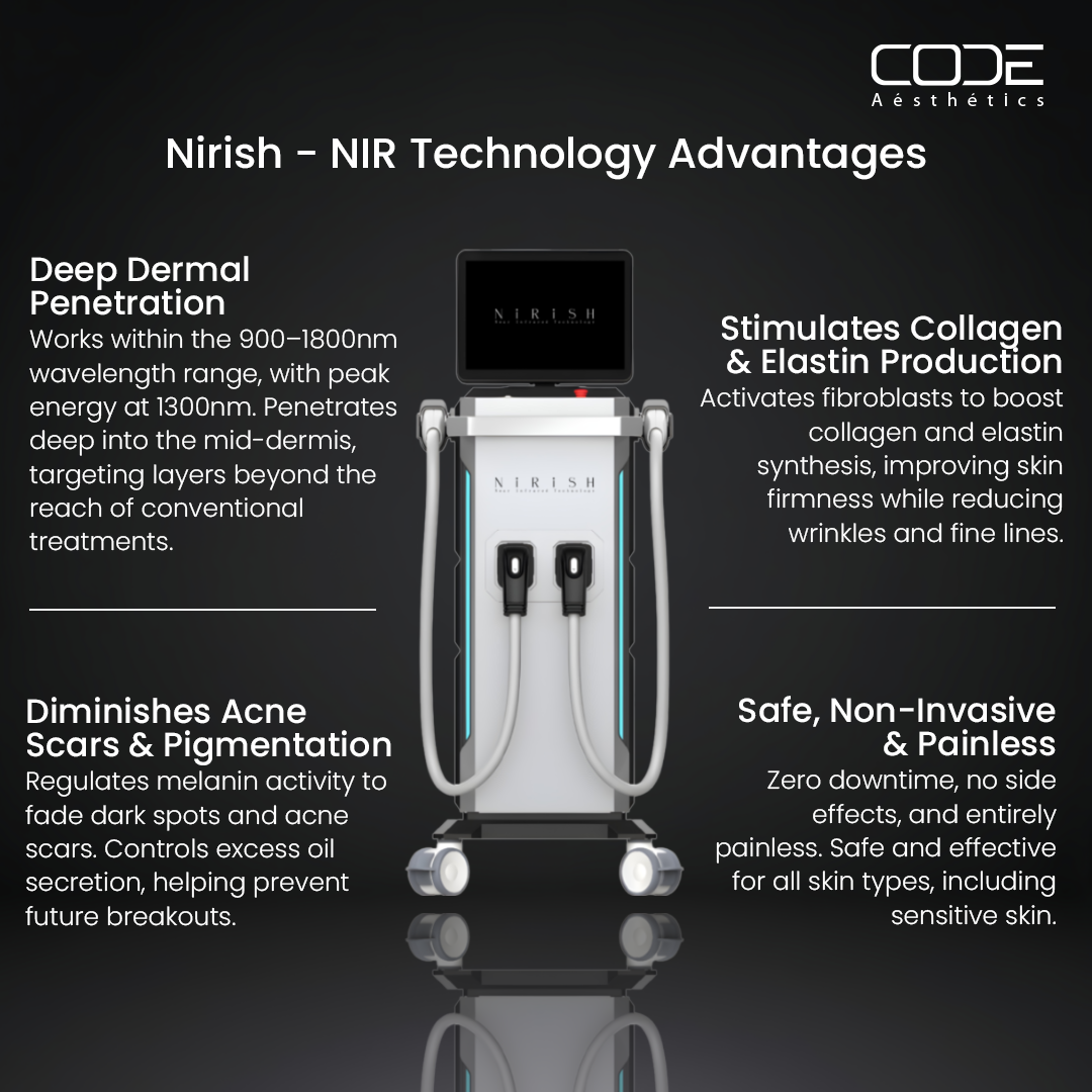 Nirish – NIR by Code Aesthetics is a cutting-edge Near-Infrared (NIR) technology device with a 900–1800nm wavelength range and peak power at 1300nm, designed for non-invasive, painless skin rejuvenation. It stimulates collagen and elastin production, improves vascular function, and accelerates cellular repair for anti-aging, skin tightening, and scar reduction. The device delivers deep dermal penetration with zero downtime, making it safe and effective for all skin types. Ideal for professional dermatology and aesthetic clinics.
