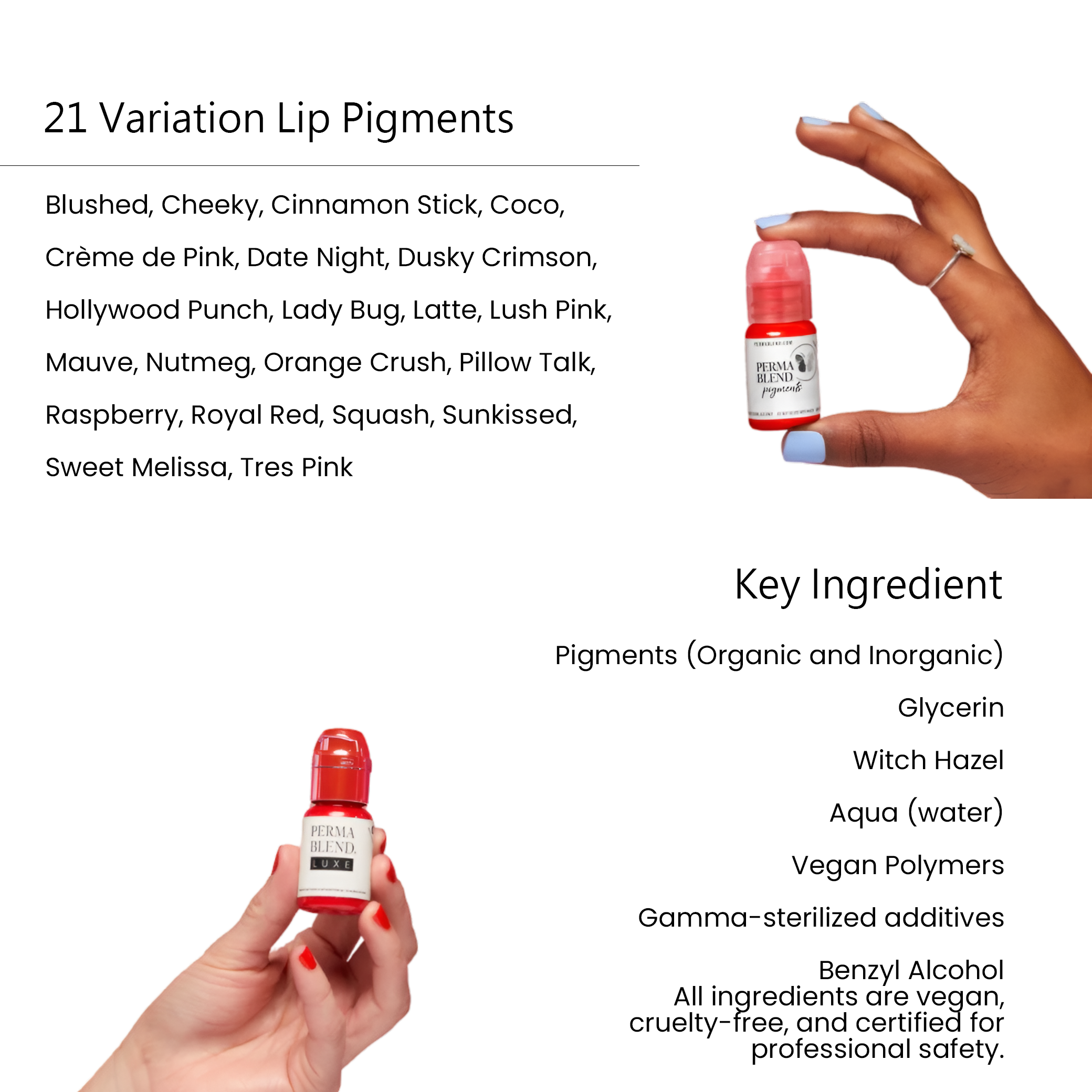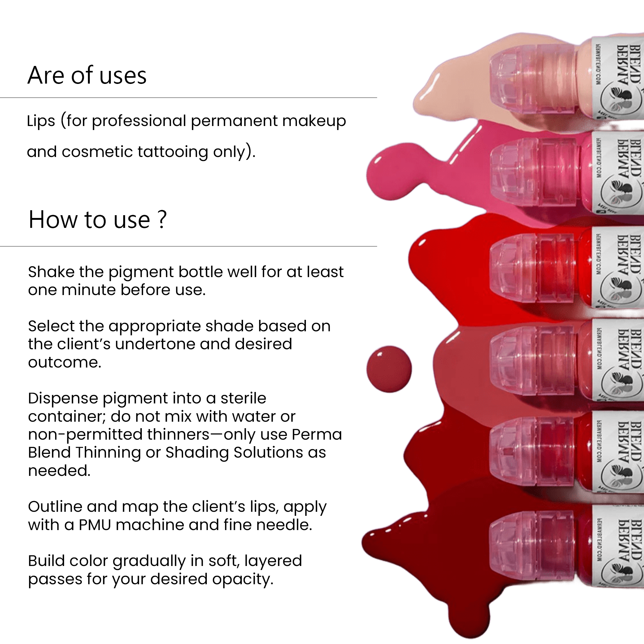 Permablend PMU Lip Pigments are vegan-friendly, professional-grade pigments designed for lip blushing, tattooing, and corrective PMU. With a balanced mix of organic and inorganic colorants, they deliver vibrant, true-to-tone results with excellent retention and minimal touch-ups. Gamma-sterilized and waterproof, these pigments are safe for all skin types, fade-resistant, and available in 20+ rich shades—ensuring consistent, natural-looking lips every time.