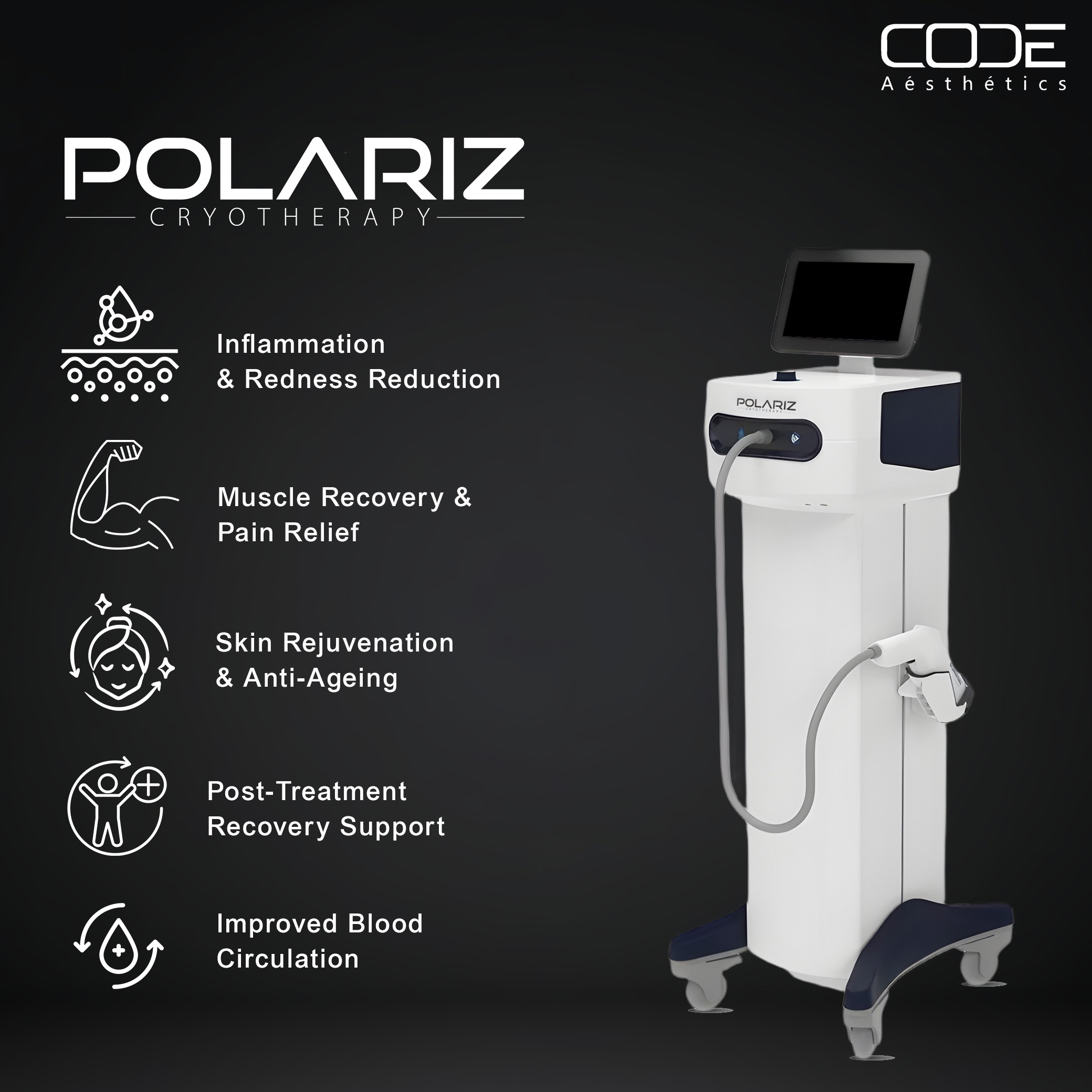 Polariz Cryotherapy Gun Machine designed for facial and body recovery treatments in Hospital, physiotherapy, and wellness clinics. This advanced cold therapy device delivers controlled, touch-free cryotherapy to reduce inflammation, calm skin, relieve pain, and accelerate post-treatment recovery safe, non-invasive, and zero downtime.