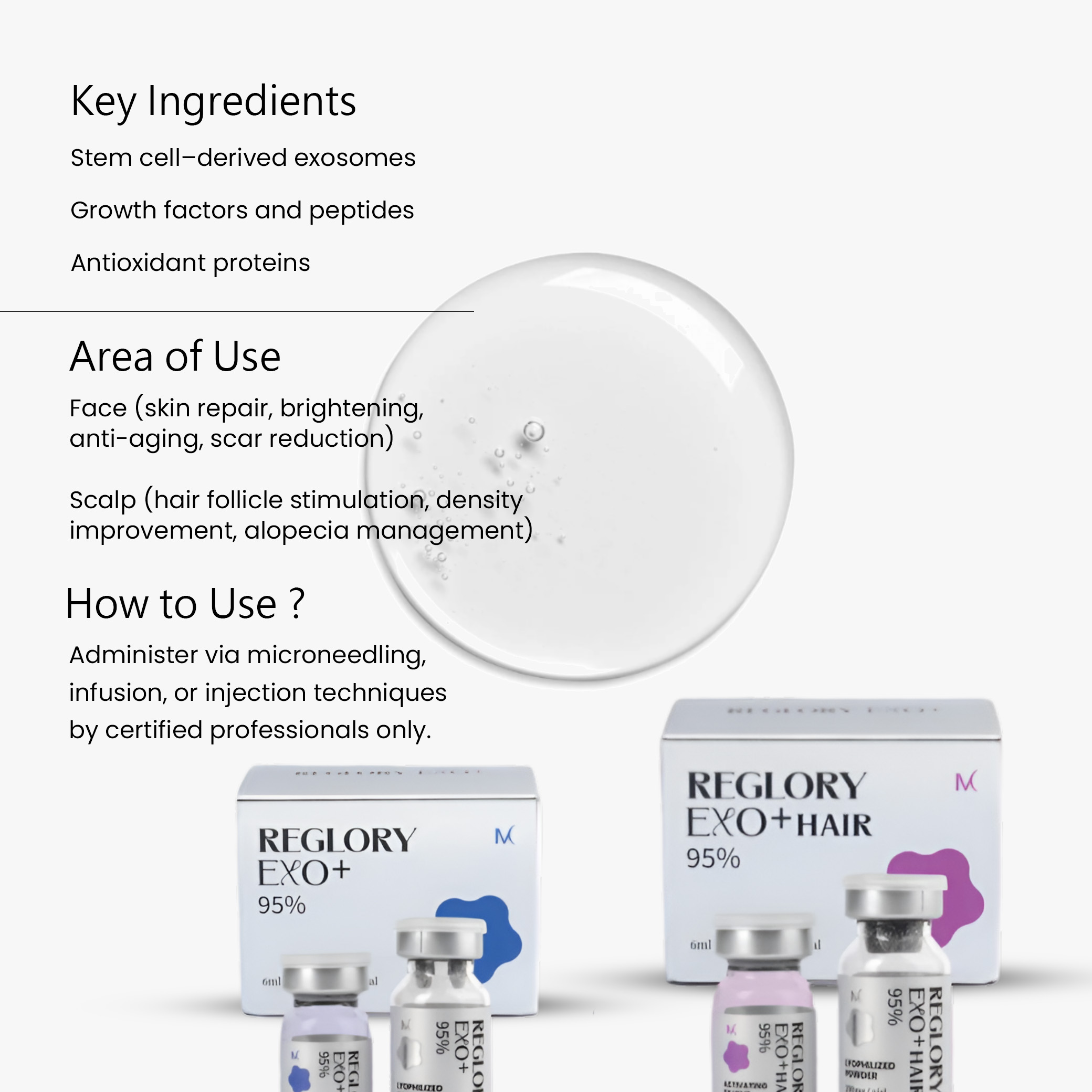 REGLORY Exosome is a Korean-origin, stem cell–based exosomal therapy formulated for deep cellular repair. Designed to combat aging, pigmentation, and hair loss, it promotes skin brightening, scar reduction, wrinkle improvement, and follicle revitalization for long-term rejuvenation and regeneration.