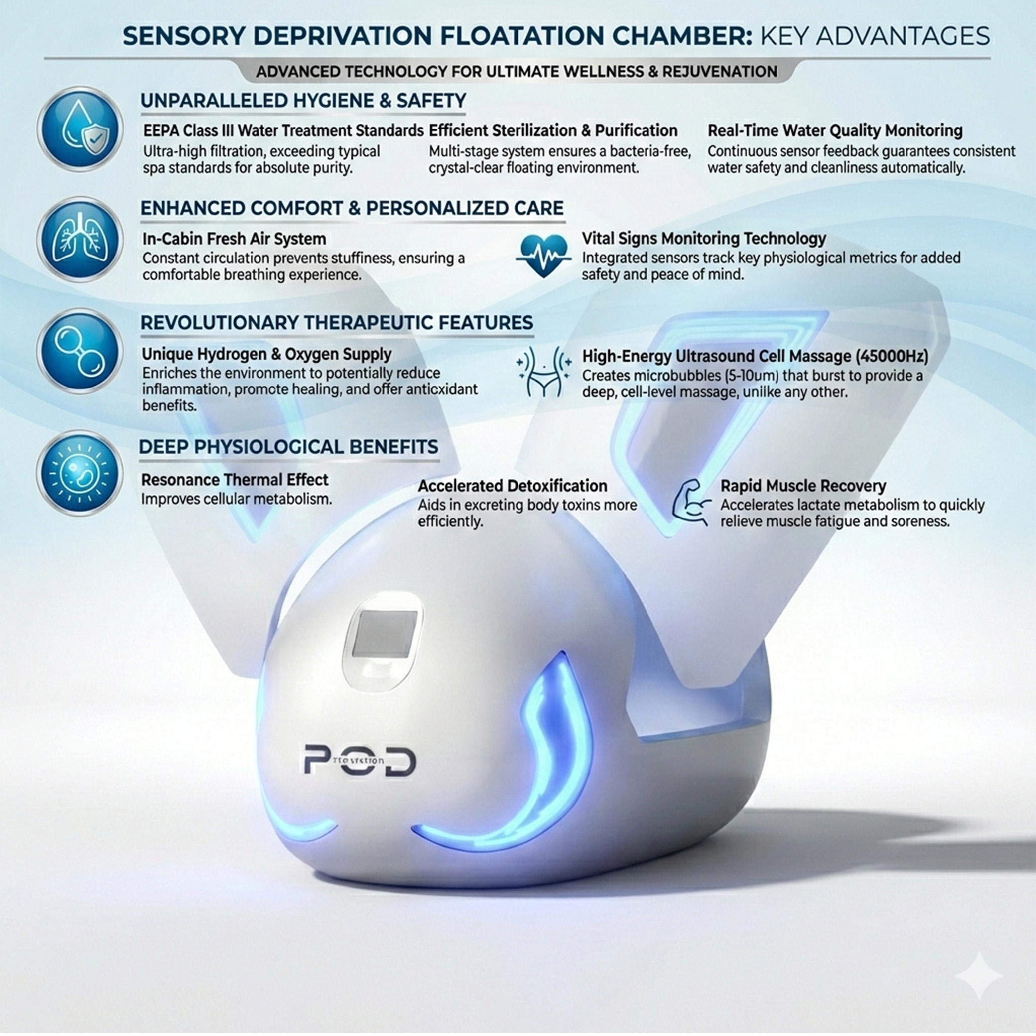 This float therapy pod offers multiple core functions, including ultrasonic massage, vital signs monitoring, water quality detection, and water flow control. Optional features such as NFT chips, bone conduction sound, aroma atomisation, starry sky ceiling, and floating liquid hydrogen enrichment enhance the experience for professional wellness centers and spas.