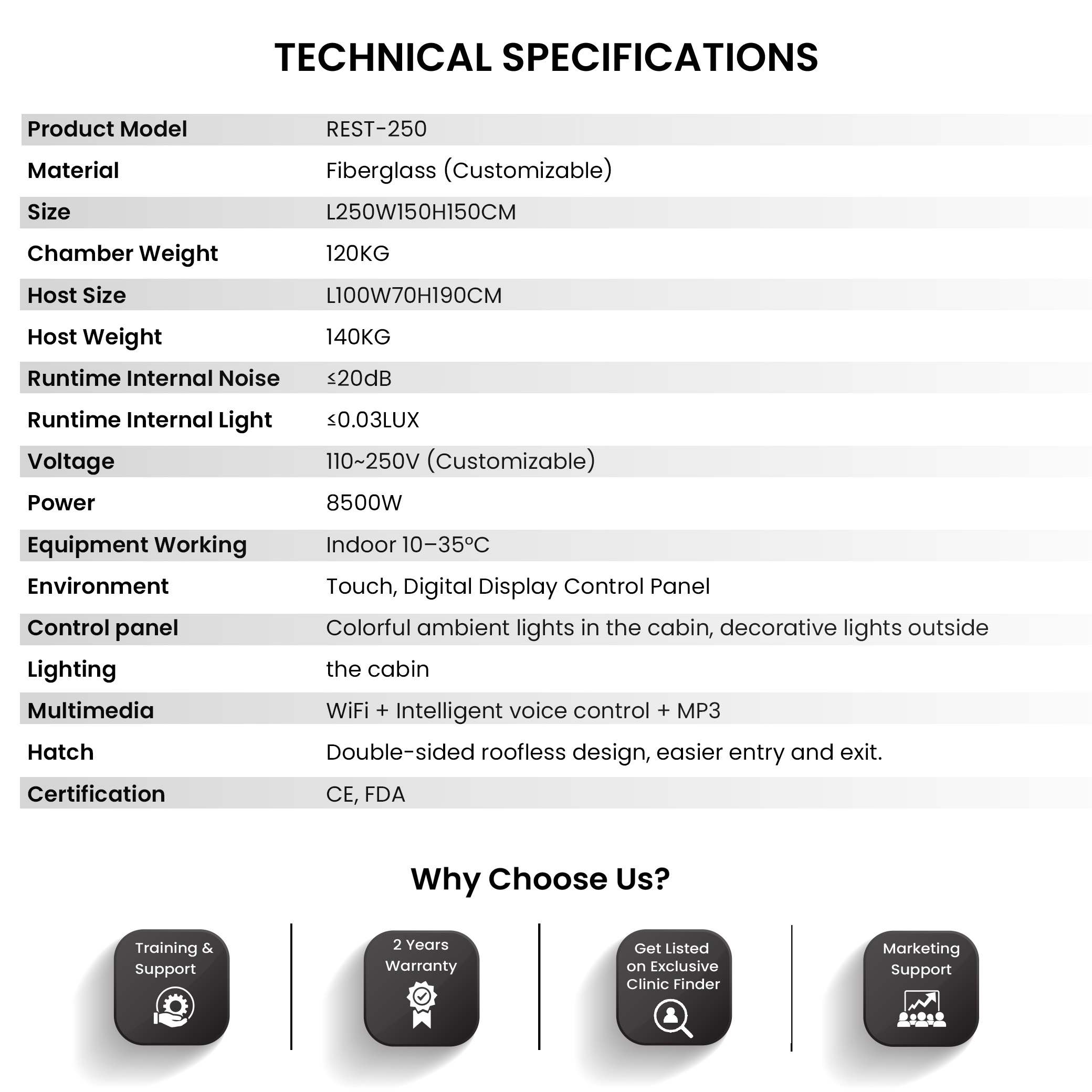 Constructed from premium fiberglass, the chamber measures 253×152×128 cm with a host size of 100×70×190 cm and weighs 100 kg for the chamber and 140 kg for the host. The tank is equipped with an advanced PLC + Voice Control system, automatic electrical access control, and precise temperature regulation that maintains water at skin-friendly levels. The EEPA Class III water treatment, combined with UV + Ozone disinfection and automatic dosing, ensures the highest hygiene standards, while the aerogel insulation layer keeps the chamber energy efficient.